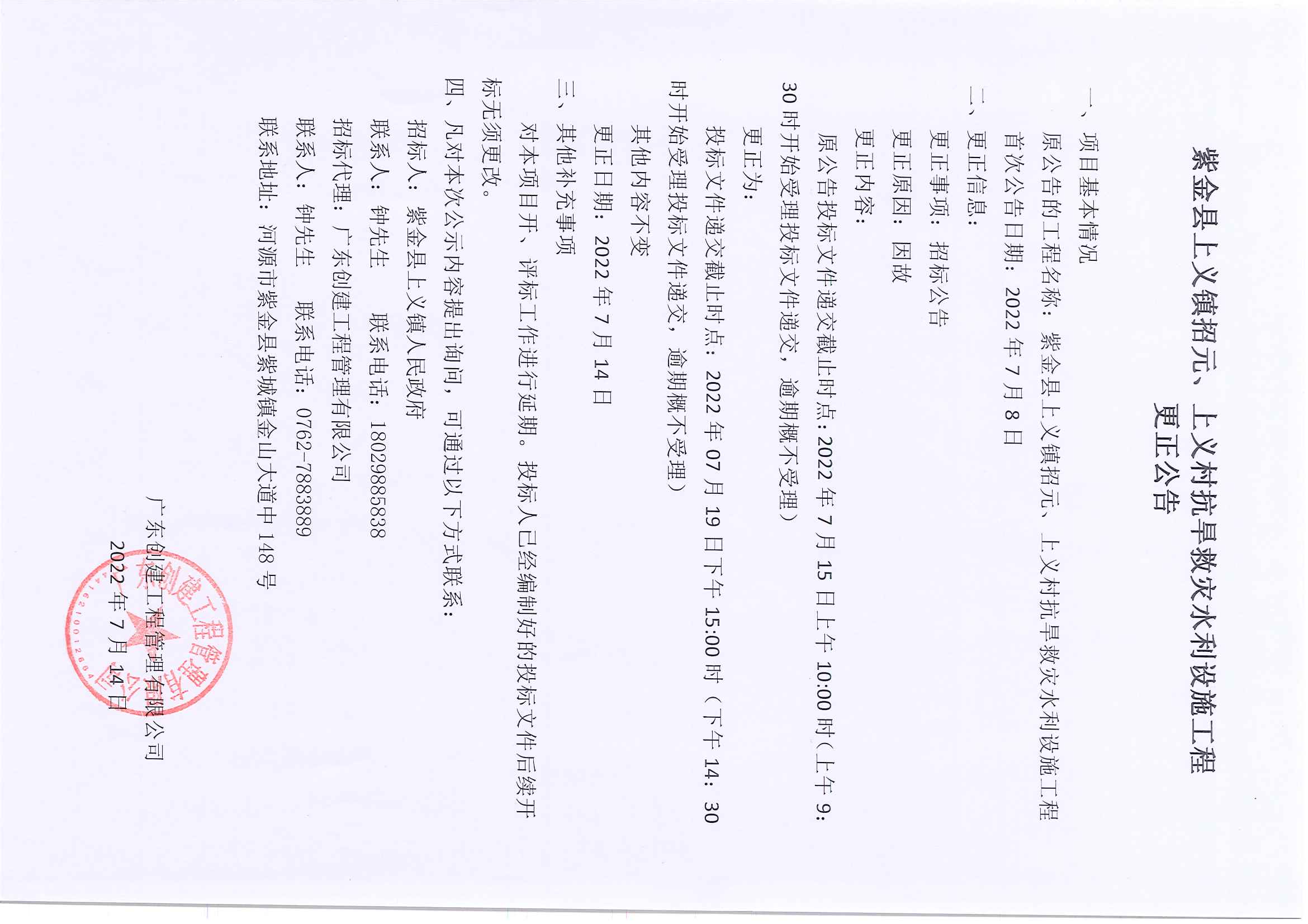 原公告的工程名称:紫金县上义镇招元、上义村抗旱救灾水利设施工程